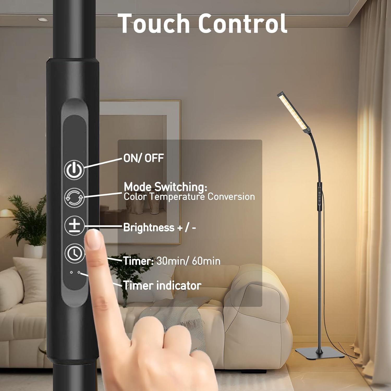 120 LED Floor Lamp, Bright Floor Lamps for Living Room, 3 Colour Modes & 10 Brightnesses, 3000K-6000K Parking Light, Gooseneck Reading Lamp with Touch Control for Bedroom, Office