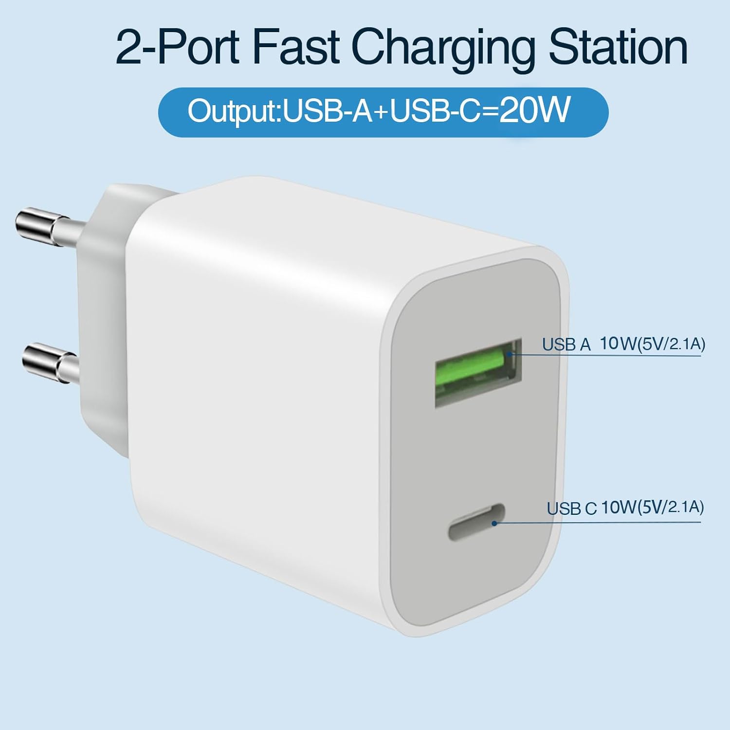 Text reads '20W USB C Charger' '2 in 1 Meet All Your Charging Needs'. White charging adapter with smartphone showing charging animation.Text reads '20W USB C Charger' '2 in 1 Meet All Your Charging Needs'. White charging adapter with smartphone showing charging animation.