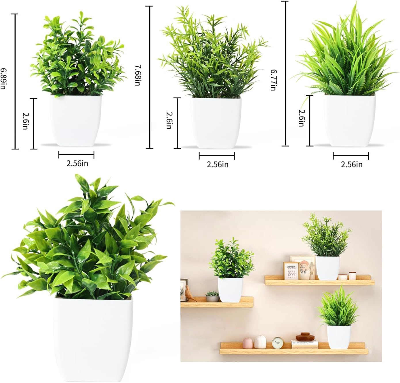 Natürliche Optik: Unser Set enthält vier unterschiedliche Arten von grünen Kunstpflanzen, die realistisch aussehen und eine angenehme Atmosphäre schaffen. Die Blätter durch Transport zusammengedrückt werden. Wenn Sie die Plastikpflanzen erhalten, kämmen Sie bitte die Blätter, damit sie prall und üppig aussehen.