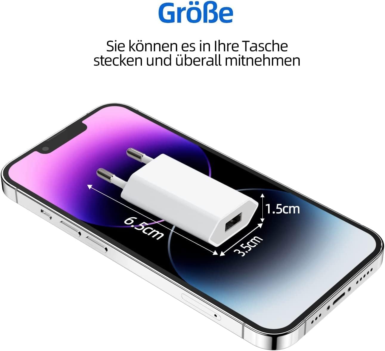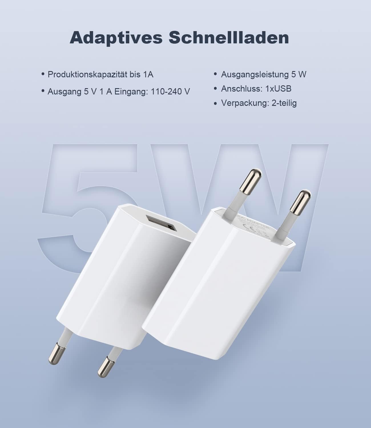 5W USB charging plug: input 100-240V, 50/60Hz, output 5V, max 1Amp, 2-piece USB adapter, compatible with all smartphones, tablets and other small electronic devices that require 1 amp power.
