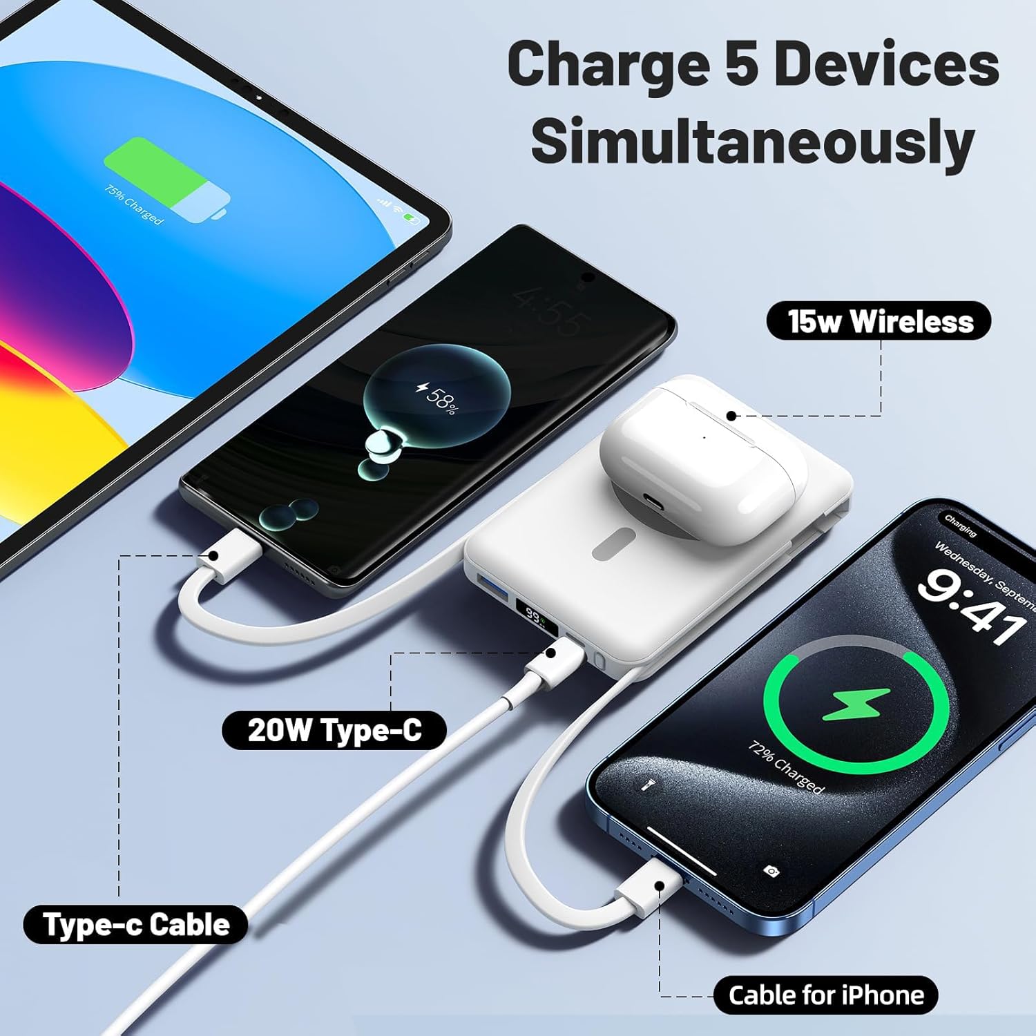 TWO CABLE & FOLDABLE STAND This magnetic portable charger has two built-in charging cables that are compatible with most devices, so you don’t have to take extra cables with you. The wireless magnetic portable charger features a versatile built-in folding kickstand that can replace your phone holder and keep your iPhone 17/16/15/14/13/13/12 upright to ensure a comfortable viewing angle
