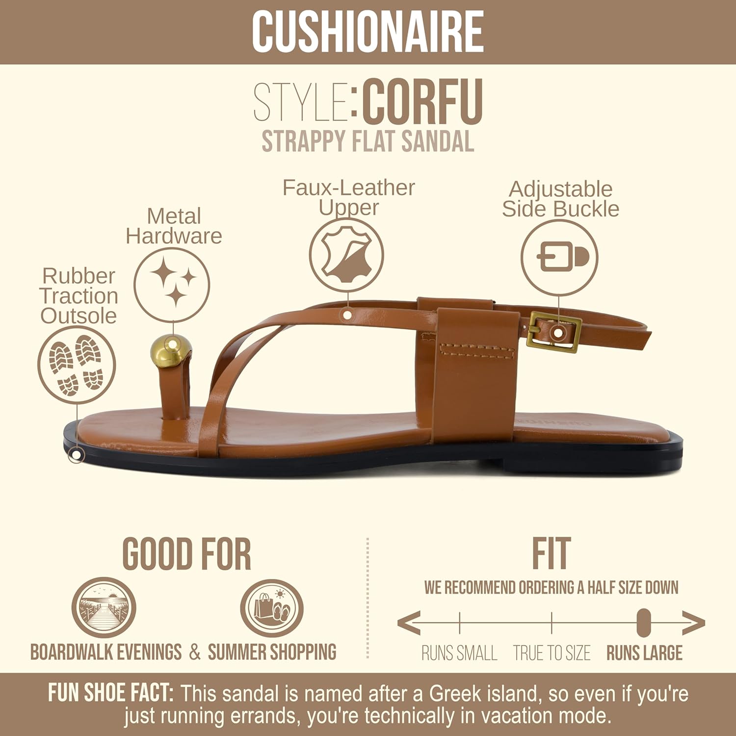 CUSHIONAIRE Corfu Flat Sandals for Women – Strappy Design with Toe Loop and Adjustable Ankle Strap – Lightweight Summer Dress Sandal