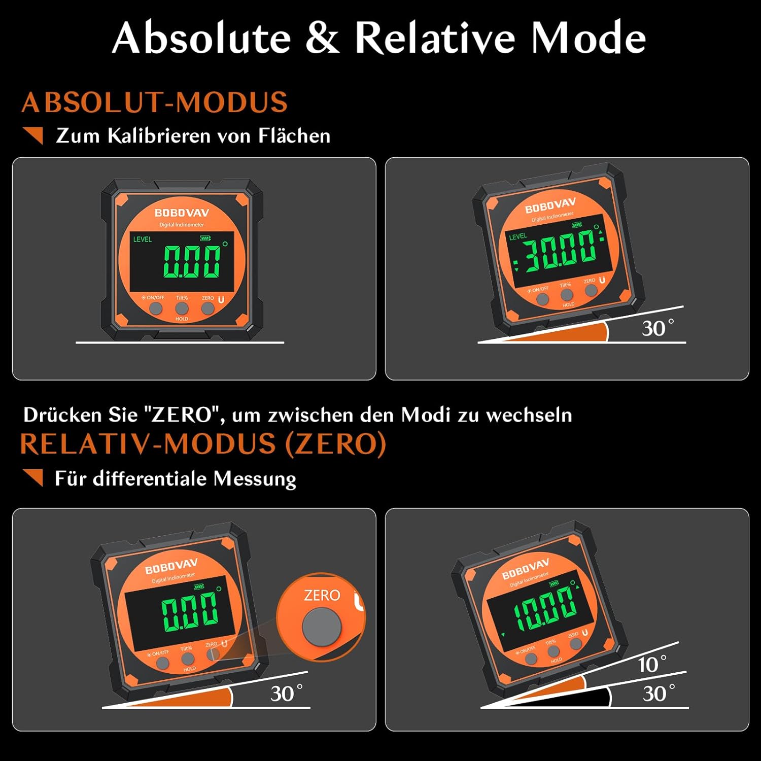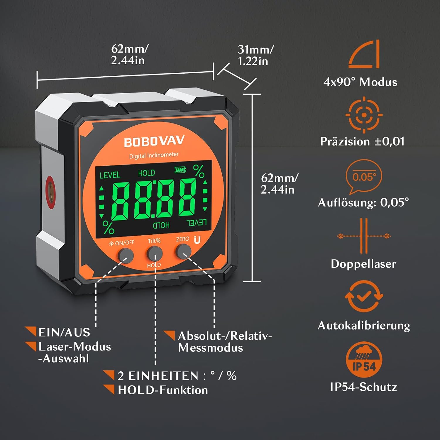 Double laser & 4-way magnet: BOBOVAV digital protractor projects two laser lines for direct visual control. Strong 4-sided magnets securely stick to metal (e.g. saw, carrier) for hands-free work. Ideal for wood, picture hanging, roof slope (laser class 2, <1mW, safe)