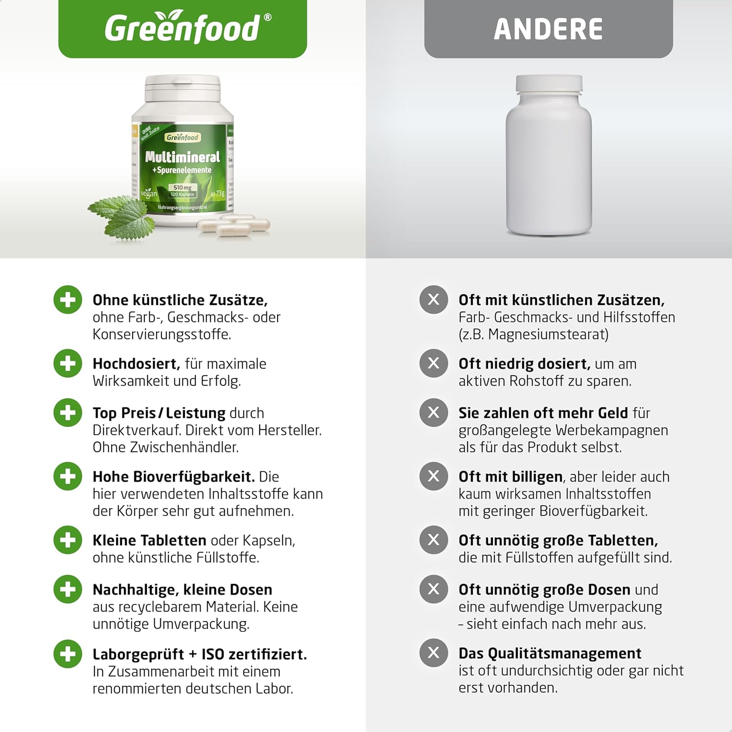 Optimal value for money: enjoy high-quality multiminerals and trace elements at a price that inspires. Each capsule provides a comprehensive supply of minerals and trace elements for your health and your daily dose of natural support with Greenfood.