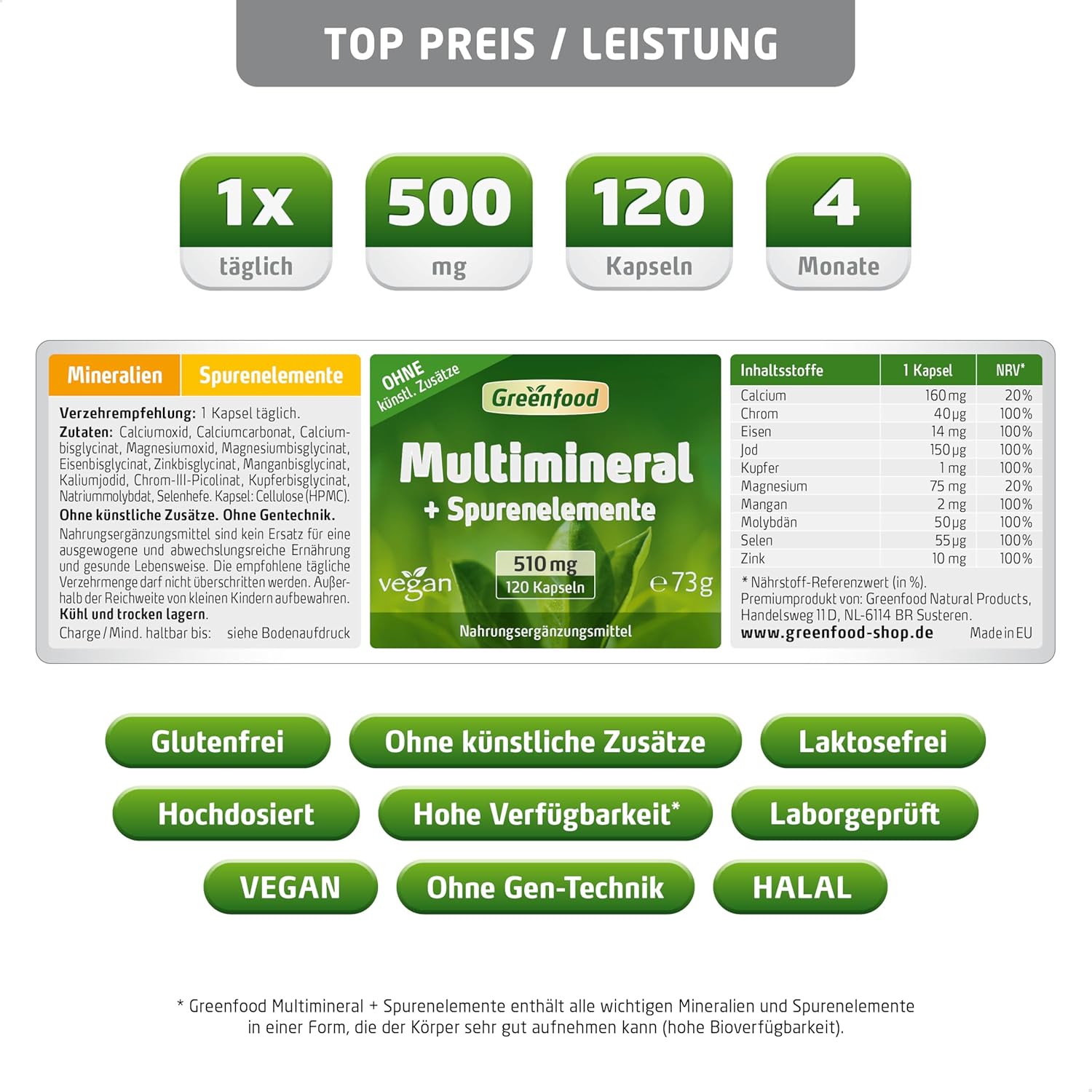 Greenfood Multimineral, High Dose, 510 mg – 120 Capsules, Vegan. Mineral Complex & Trace Elements – Magnesium, Calcium, Zinc, Selenium & Iodine – for Bones, Hair, Nails & Nerves. From Greenfood.