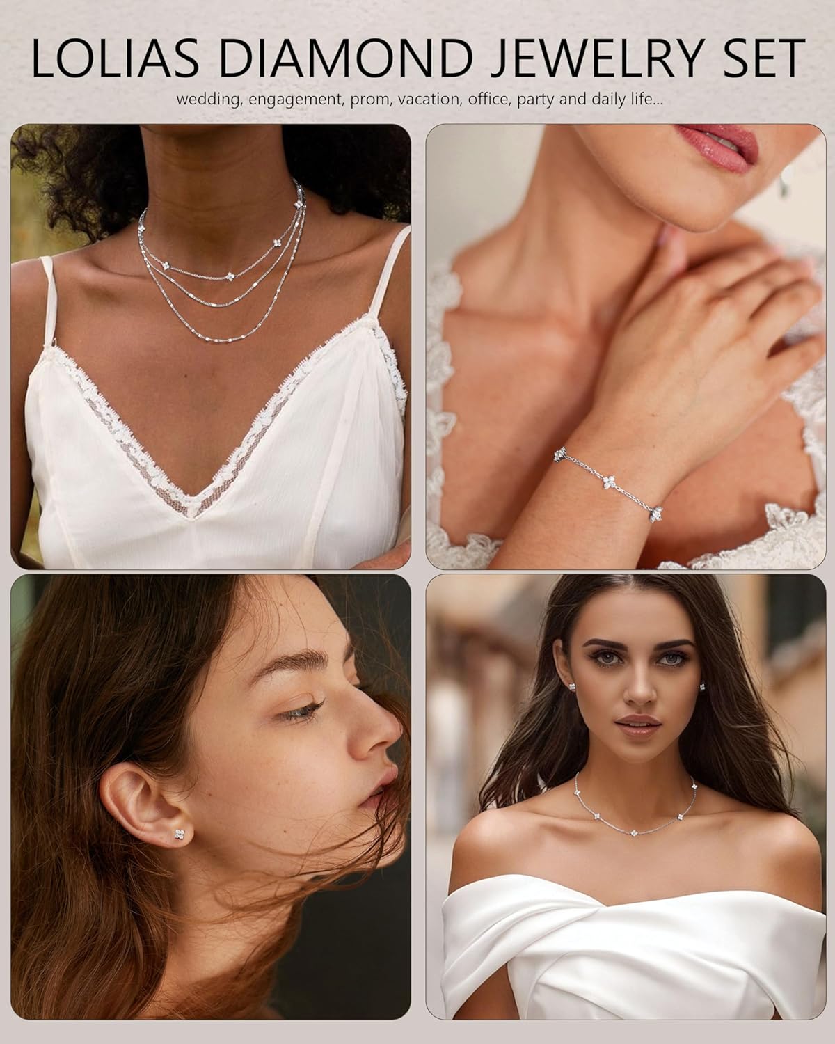 LOLIAS Chain Silver 925 Women’s Stud Earrings Gold Bracelet Set Adjustable Choker Necklace Link Chain with Cute Cubic Zirconia Dainty Wedding Bridal Jewellery Set