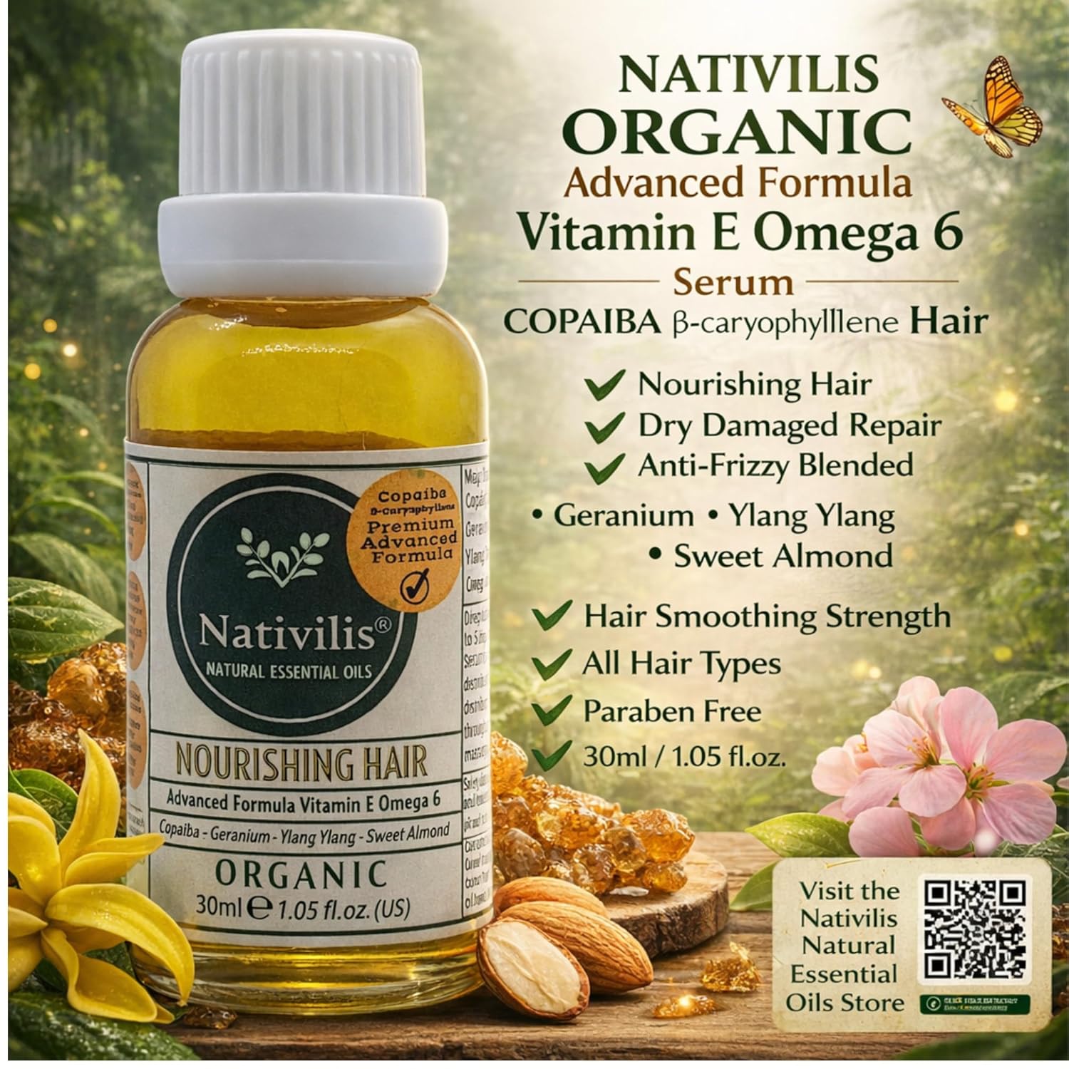 Nativilis Organic Advanced Formula Vitamin E Omega 6 Serum COPAIBA β-Caryophyllen (BCP) Strength of Hair Straightening Dry Damage Repair Anti-Frizzy Blended Geranium Ylang Sweet Almond