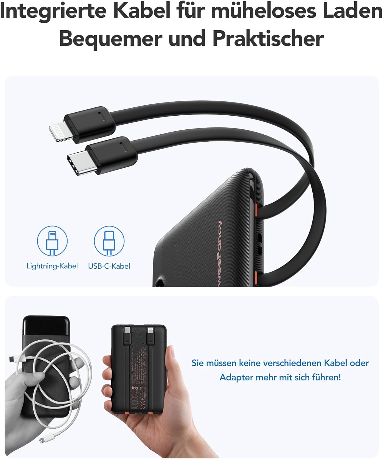 Power Bank 10000 mAh Power Bank Small PD 22.5 W Mini Power Bank with Integrated Cables, USB C External Mobile Phone Batteries, 3 Outputs & 3 Inputs, Compatible with iPhone/Samsung/Huawei