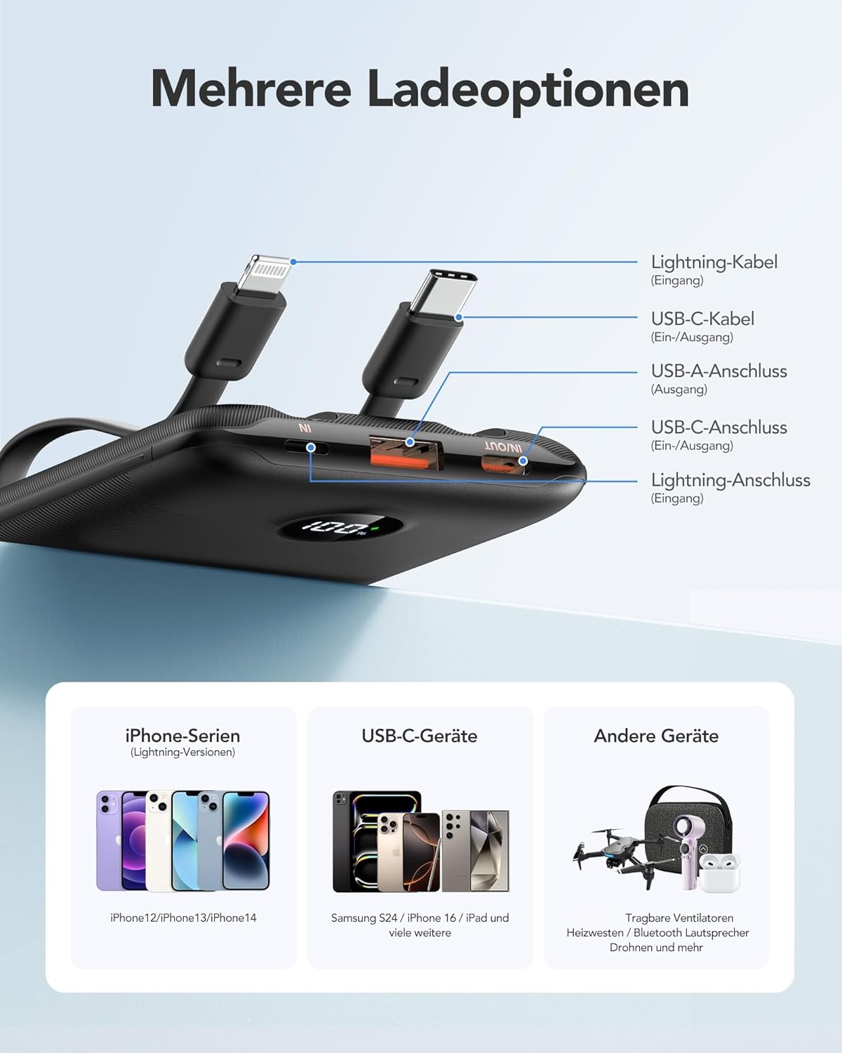 Compact, lightweight & thin: Experience unparalleled portability with the slimmest and smallest portable charger with built-in cables. Weighing only 165 g and a credit card-sized design, it is the ultimate mini power bank for on the go. Slip it into your pocket effortlessly