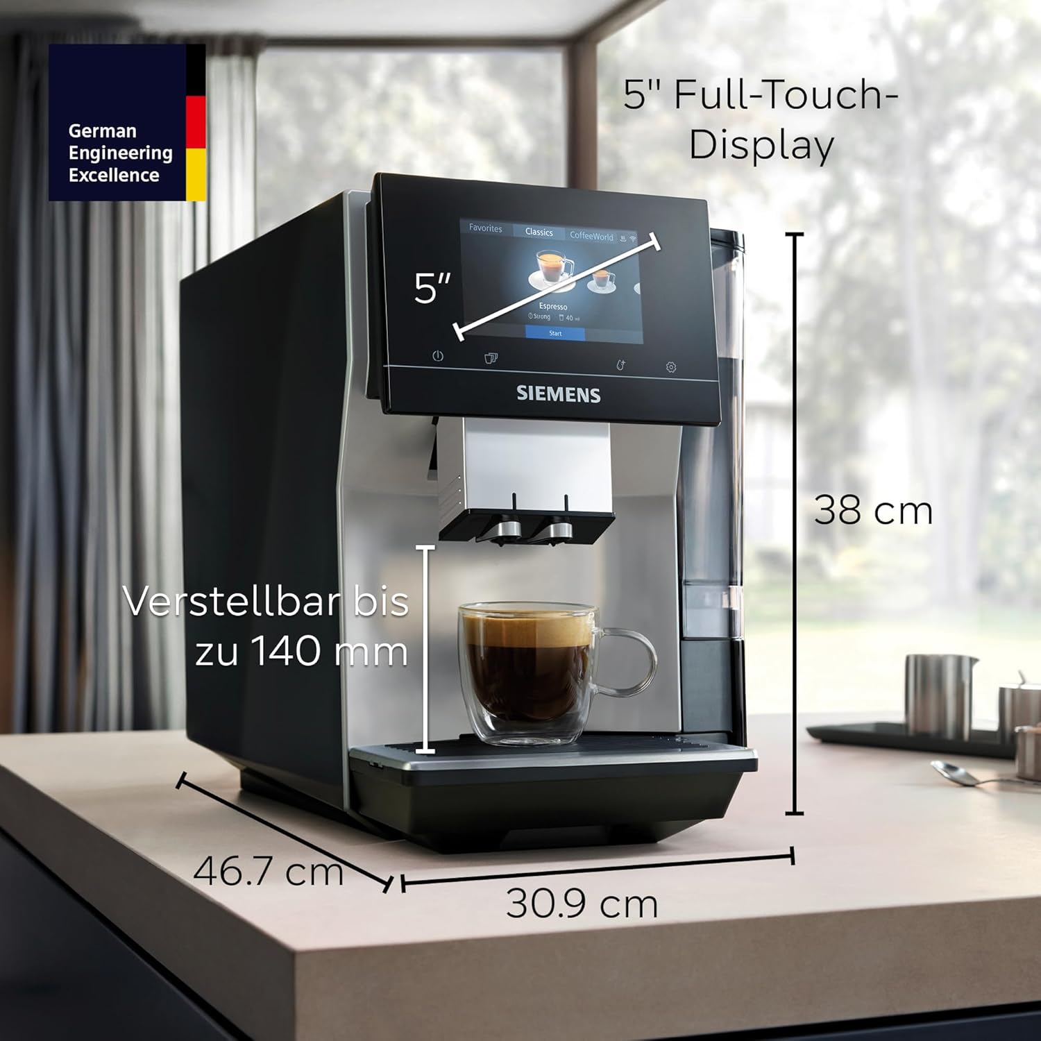 The Siemens fully automatic coffee machines impress with a clear yet detailed design language. High-quality materials and precise workmanship ensure an elegant appearance and intuitive operation. This makes your home a stylish coffee bar for coffee enjoyment just like from the barista. Siemens combines design and functionality at the highest level, suitable for any kitchen and style.