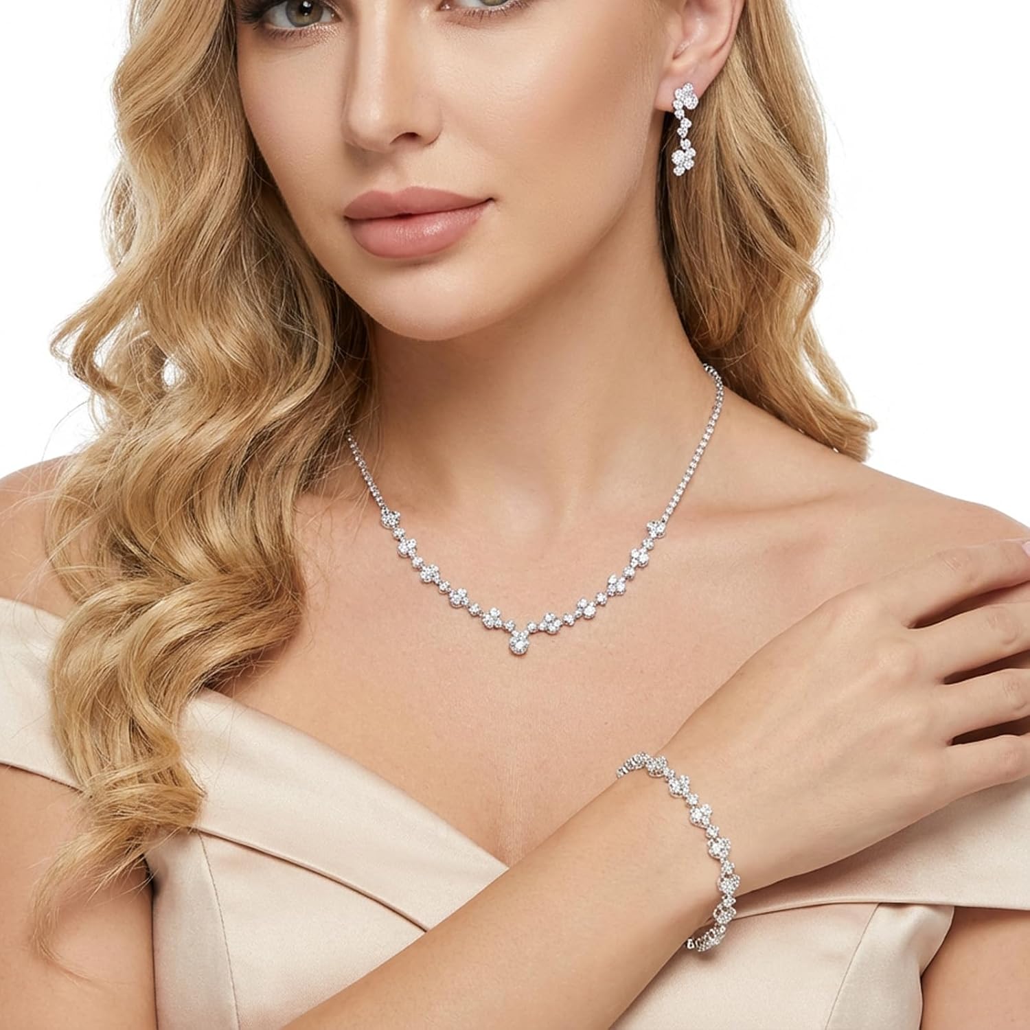 Silver Jewellery Set for Women Necklace Silver Earrings Hanging Jewellery Set Bridal Jewellery Crystal Rhinestone Necklace Bracelet Jewellery Set for Bride and Bridesmaid Women’s Jewellery