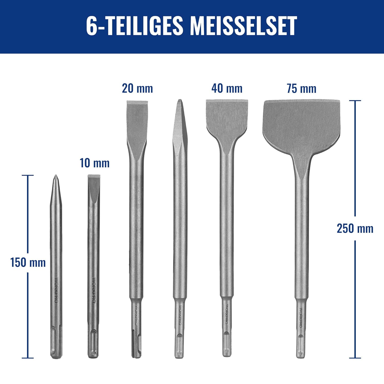 Practical storage case: the 9 drill bits and 6 chisels come in a durable blue WORKPRO box and are well secured and organized for easy transport and better protection. Total weight of approx. 2.3 kg
